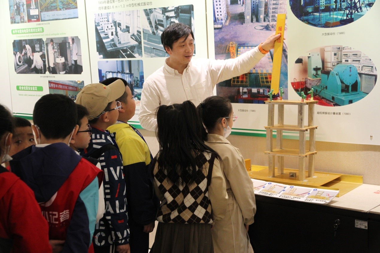 講座結束后,張昊宇副研究員帶領小記者們參觀并實踐了一系列的科普實驗。來到鐵路地震監測預警系統展臺,了解地震后該系統如何保障高鐵安全運行的原理。通過學習和思考,小記者們提出許多問題,例如“中國古建筑為何能夠跨越千年不倒”,張昊宇結合提問講解了中國傳統木結構的抗震機理知識。最受小記者們歡迎的還是微型振動臺模擬實驗和搖擺墻結構無損倒塌模型實驗。每一位小記者都親手操作搖擺墻結構無損倒塌模型,近距離直觀地認識到不同建筑結構抗震能力的強弱區別,學習了建筑結構抗震的基本知識。