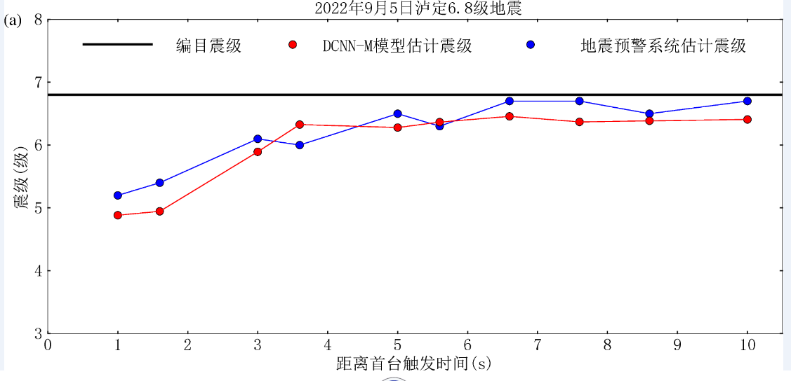 圖3展示了人工智能DCNN-M震級(jí)估算結(jié)果隨時(shí)間變化的過程,可以看到,在此次瀘定6.8級(jí)地震中,首臺(tái)觸發(fā)后1秒人工智能與傳統(tǒng)震級(jí)估算模型都可以給出震級(jí)估算結(jié)果,首臺(tái)觸發(fā)2秒后人工智能震級(jí)估算結(jié)果上升速率較傳統(tǒng)震級(jí)估算模型更快,首臺(tái)觸發(fā)后3.5秒人工智能震級(jí)估算結(jié)果為6.2級(jí)、較傳統(tǒng)震級(jí)估算模型更接近編目震級(jí),隨后人工智能震級(jí)估算結(jié)果知道首臺(tái)觸發(fā)后10秒都穩(wěn)定在6.3級(jí),與傳統(tǒng)震級(jí)估算模型相當(dāng)。