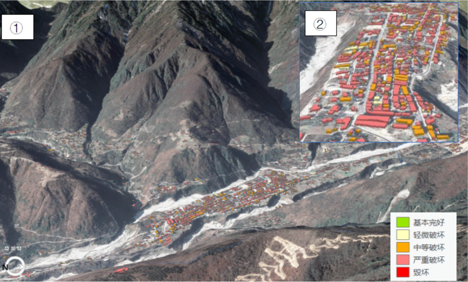 圖3 災(zāi)區(qū)建筑物震害評估結(jié)果(磨西鎮(zhèn)及其周邊,①為全景,②為放大圖)