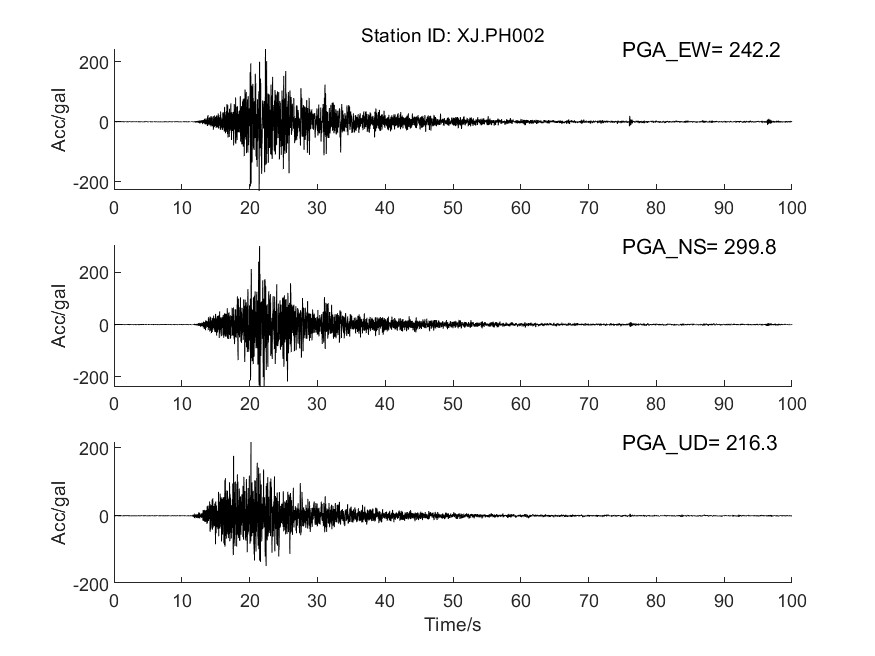 地震后工力所強震動觀測中心共收取距震中100公里范圍內實時強震儀記錄8組、烈度儀記錄18組,繪制了此次地震的儀器地震烈度(圖1)、峰值加速度(圖2)、峰值速度空間分布圖(圖3),以及典型記錄的時程曲線和反應譜(圖4-7),供應急參考。