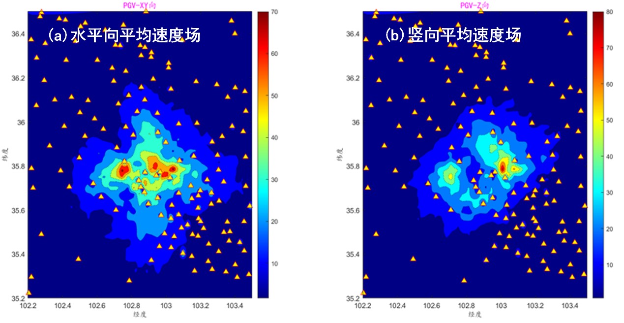 進一步,我們結合震源反演初步結果,采用USTClitho2.0公共波速結構模型(見圖5)和確定性地震動模擬技術,初步再現地震動場的時空發育過程。我們采用了歷史統計得到的破裂時間過程函數,同時考慮了此次地震應力降高的特性。圖6給出了模擬的水平向和豎向峰值速度空間分布。從模擬結果可以看出,盡管沒有考慮地表土體對地面運動速度的放大作用,模擬值偏低,但模擬結果與烈度儀實測峰值速度場大致吻合。為此,進一步確定了發震震源的高應力降是造成此次地震記錄高異常峰值普遍存在的主要原因。