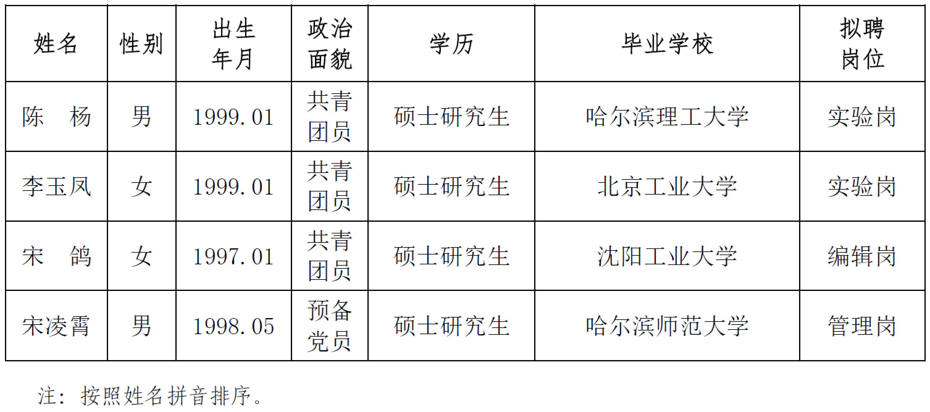 發(fā)布時(shí)間: 2024-05-14 點(diǎn)擊數(shù)量:13125根據(jù)中國(guó)地震局《關(guān)于貫徹執(zhí)行〈事業(yè)單位公開(kāi)招聘人員暫行規(guī)定〉的通知》文件精神和我所用人計(jì)劃,經(jīng)公開(kāi)發(fā)布招聘信息、資格審查、面試等程序確定擬錄人員?,F(xiàn)將擬錄人員相關(guān)情況公示如下,公示期7個(gè)工作日,期間如有異議請(qǐng)與中國(guó)地震局工程力學(xué)研究所人才資源部或紀(jì)檢室聯(lián)系,以個(gè)人名義反映情況的領(lǐng)署真實(shí)姓名,以單位名義反映情況的須加蓋公章。
